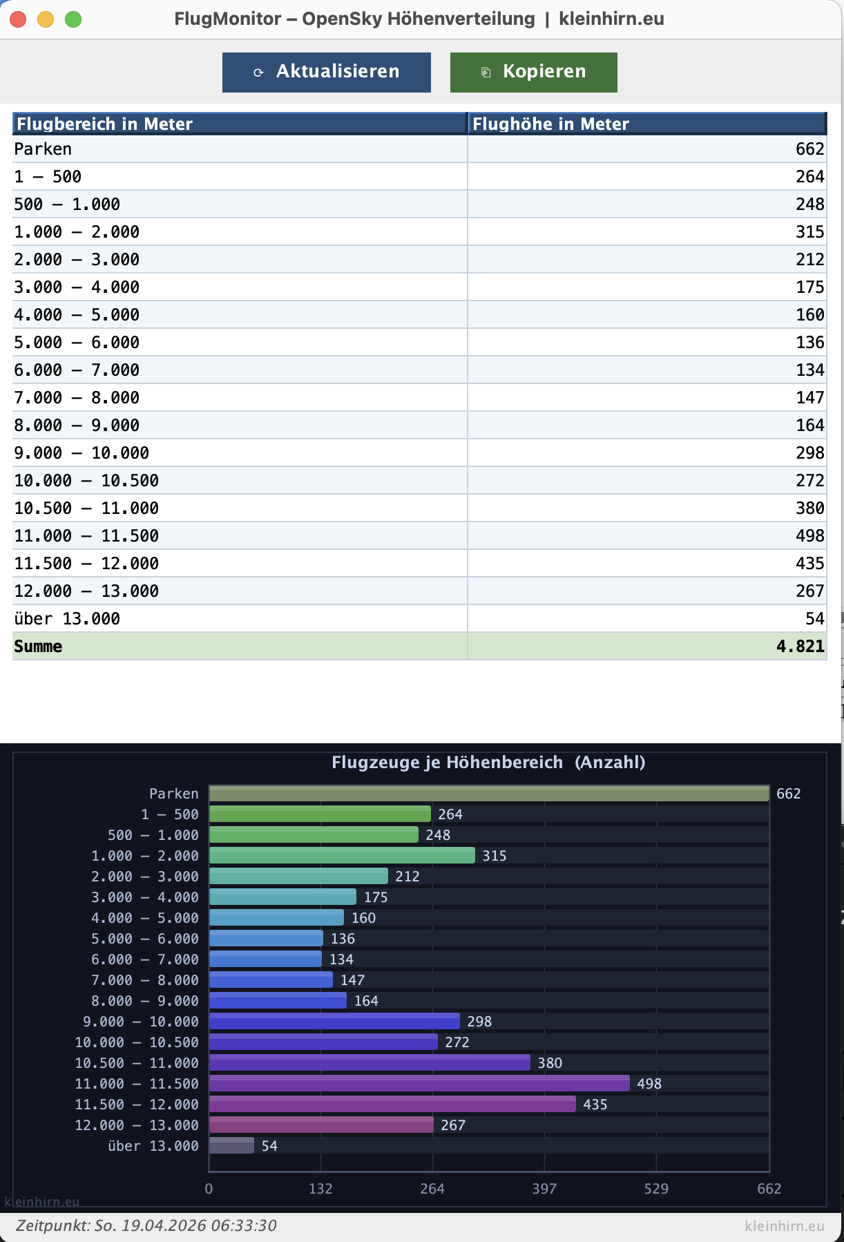 Das Besondere: Die Anwendung fragt bei jedem Klick auf „Aktualisieren“ live die OpenSky-API ab und wertet tausende Flugzeugpositionen in Millisekunden aus. Das Ergebnis landet sofort in einer übersichtlichen Tabelle und einem farbigen Balkendiagramm.