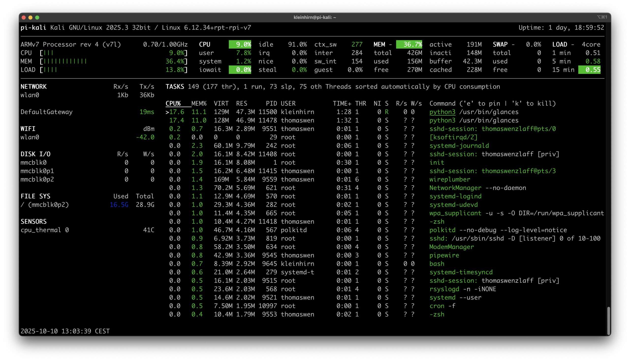Nach dem Start mit: glances wird wie z.B. auf meinem Raspi mit Kali folgendes angezeigt: