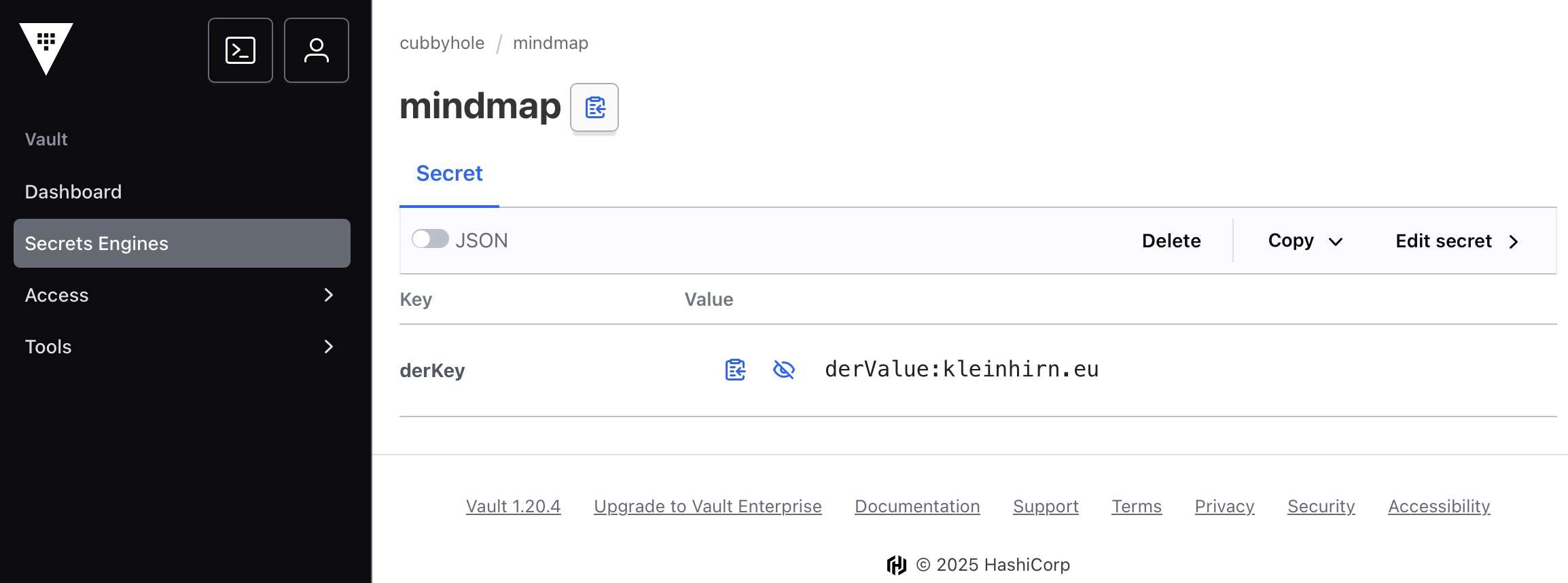 export VAULT_ADDR=https://7.7.7.93:8200 # Dann habe wir Zugriff z.B. mit vault status # Wir bekommen dann z.B. Key Value --- ----- Seal Type shamir Initialized true Sealed false Total Shares 1 Threshold 1 Version 1.20.4 Build Date 2025-09-23T13:22:38Z Storage Type file Cluster Name vault-cluster-ca72947d Cluster ID 2e39f08c-716e-8d82-d18b-a3acb23618fc HA Enabled false # Nun setzen wir erst mal den root Token export VAULT_TOKEN=hvs.BCEBFAg5qMrAkbMfc00cKsvi # nun einen eigenen Token, der nicht root ist erzeugen