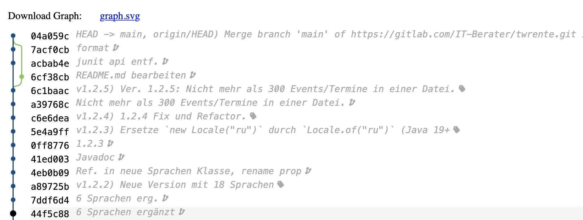 04a059c|7acf0cb 6cf38cb| (HEAD -> main, origin/main, origin/HEAD) Merge branch 'main' of https://gitlab.com/IT-Berater/twrente.git into main 7acf0cb|acbab4e| format acbab4e|6c1baac| junit api entf. 6cf38cb|6c1baac| README.md bearbeiten 6c1baac|a39768c| (tag: v1.2.5) Ver. 1.2.5: Nicht mehr als 300 Events/Termine in einer Datei. a39768c|c6e6dea| Nicht mehr als 300 Events/Termine in einer Datei. c6e6dea|5e4a9ff| (tag: v1.2.4) 1.2.4 Fix und Refactor. 5e4a9ff|0ff8776| (tag: v1.2.3) Ersetze `new Locale("ru")` durch `Locale.of("ru")` (Java 19+) 0ff8776|41ed003| 1.2.3 41ed003|4eb0b09| Javadoc 4eb0b09|a89725b| Ref. in neue Sprachen Klasse, rename prop a89725b|7ddf6d4| (tag: v1.2.2) Neue Version mit 18 Sprachen 7ddf6d4|44f5c88| 6 Sprachen erg. 44f5c88|67bd46f| 6 Sprachen ergänzt 67bd46f|7f0db31| Javadoc erg. 7f0db31|30fb15b| Bild v1.2.1 30fb15b|39e6795| SuppressWarnings 39e6795|c3e550d| Doc c3e550d|3d7c404| GenerateEventAction in eigene Klasse 3d7c404|ae100be| Doc ae100be|59f658d| Kleines Icon erg. 59f658d|fba9cc0| Erw. bei fehlenden Prop. Exc. gefangen. fba9cc0|9b00821| Java 21 Modul erstellt, Kalender verschoben, Gui Ref. 9b00821|913cade| (tag: v1.20) Nun mit Menü und 12 Sprachen 913cade|2f5615e| Sprachen übersetzt 2f5615e|8990250| Gr und Heb. 8990250|dac7582| Hindi und Arabisch erg. dac7582|bfcc34a| Exit Button gelöscht bfcc34a|066a21a| 8 Sprachen mit neuem Menü 066a21a|96f8ddf| Übersetzungen ergänzt 96f8ddf|01f0040| Alles auf englisch, auch Save Dialog 01f0040|9effc6c| Fix falschen Dateinamen, de 9effc6c|8cc4ead| Gui engl. schon mal ok 8cc4ead|4a2735b| Englisch vorbereitet 4a2735b|ada8920| (tag: v1.1.4) Neuen Hyperlink für Info auf Webseite ada8920|a1f063d| Ref. rename a1f063d|08c0911| Bilder 1.1.4 08c0911|8aacf63| Ref. rename GenerateEventAction 8aacf63|4f16f7e| Ref. ActionListenerImplementation erst. 4f16f7e|37d383c| Add Checkbox optimiert 37d383c|34b9267| Neuen JUnit Test 34b9267|1de4f87| Fix Javadoc 1de4f87|5eadf0f| Neue JUnit Test testGenerateICSFileZweiTag 5eadf0f|8098228| JUnit Test für Wochentage angepasst 8098228|46c1a0a| Locale auf DE 46c1a0a|c373afe| Frame zentrieren c373afe|3c9959b| Ref. eigene Main 3c9959b|bdcd084| Mit Wochentag Checkbox bdcd084|e2b8c44| 1.1.3 Gui kleiner e2b8c44|9b8cd9d| Bild mit höherer Auflösung 9b8cd9d|8ce82ee ec3196f| Merge branch 'main' of https://gitlab.com/IT-Berater/twrente ec3196f|7076cd1| LICENSE bearbeiten 7076cd1|9ae0001| Neue Datei hinzufügen 8ce82ee|f81187c| 10 Pixel linker Rand für Label f81187c|c1fbf46| clean c1fbf46|f23fefe| File Filter um ical erg. f23fefe|8032aaf| eine weltweit eindeutige PRODID erg. 8032aaf|cb3d7e5| Bild cb3d7e5|9ae0001| Neuer Ablauf mit Save Dialog 9ae0001|c13ea24| (tag: v1.1.2) Readme erg. c13ea24|951f6bd| Ablauf erg. 951f6bd|1f10bad| Bild in Readme und Link angp. 1f10bad|10ce09e| Readme erg. 10ce09e|0db8231| Java Doc, und vorbereitet für nächste Maven Version 0db8231|2496f27| Speichern Text angepasst 2496f27|789a29b| Mit File Save Dialog 789a29b|0571ac1| (tag: v1.1.1-Release) v1.1.1 0571ac1|d897d64 5cdd4ef| Merge branch 'main' of https://gitlab.com/IT-Berater/twrente 5cdd4ef|17f4494| Datei .gitlab-ci.yml aktualisieren d897d64|640bfe0 17f4494| Merge branch 'main' of https://gitlab.com/IT-Berater/twrente 17f4494|112fcba| Datei .gitlab-ci.yml aktualisieren 112fcba|154d9c3| maven:3.9.9-eclipse-temurin-21 154d9c3|6b0a89a| Datei .gitlab-ci.yml aktualisieren 6b0a89a|643370e| Datei .gitlab-ci.yml aktualisieren 640bfe0|5690d0f 643370e| Merge branch 'main' of https://gitlab.com/IT-Berater/twrente 643370e|c252645| Pipeline erg. 5690d0f|c252645| Mit Von Datum für Ereignis c252645|b708284| (tag: v1.1.1) 1.1.0 Ereignis nun frei bearbeitbar, b708284|7d16337| Neues Eingabe Feld für die Ereignisse 7d16337|689b541| Ablauf Diagramm erstellt 689b541|2c23229| Fix JUnit Test 2c23229|15b93b6| Fix, nun als ganztägiges Ereignis 15b93b6|5b841d5| 1.0.0 nach Maven Central veröffentlicht 5b841d5|bb85695| Finale 1.0.0 bb85695|deb36f1| 5. Prompt, erzeuge JUnit Testklasse deb36f1|2434716| 4. Prompt mit Exit Button 2434716|e28b36c| 3. Prompt, funktion schon mal ok. e28b36c|cbbe150| (tag: v0.0.1) Bild erg. cbbe150|2685488| Erste Version 2685488|| Initial commit |