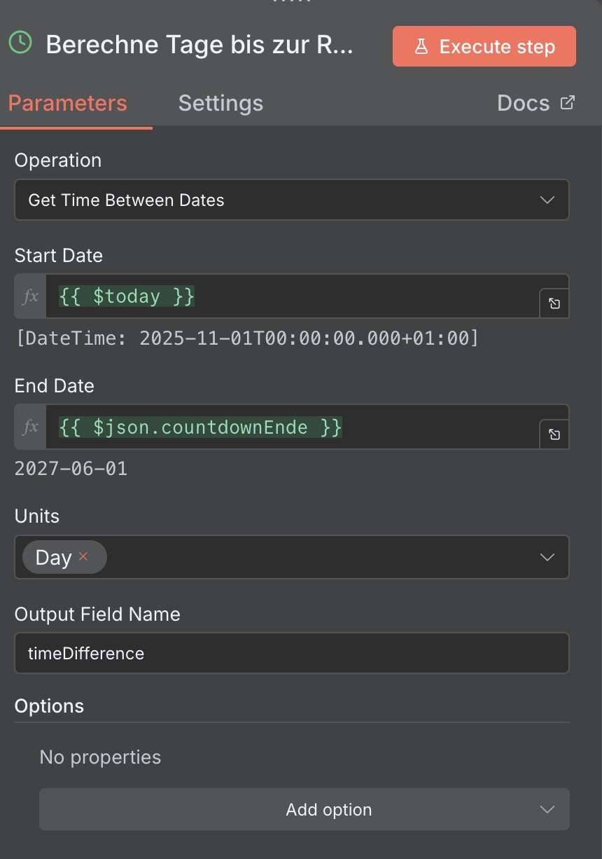 Im nächsten Schritt fügen wir eine Date & Time Node ein, die über das Menü-Action Get Time Between Dates erreichbar ist. Diese Node berechnet die Differenz zwischen dem heutigen Datum und dem festgelegten Rentendatum und gibt die verbleibenden Tage aus. Die Berechnung erfolgt auf Basis der Konstanten aus dem Edit Fields Node, wodurch Flexibilität und Wartbarkeit gewährleistet sind. Im Node sind nur diese Einstellungen nötig: