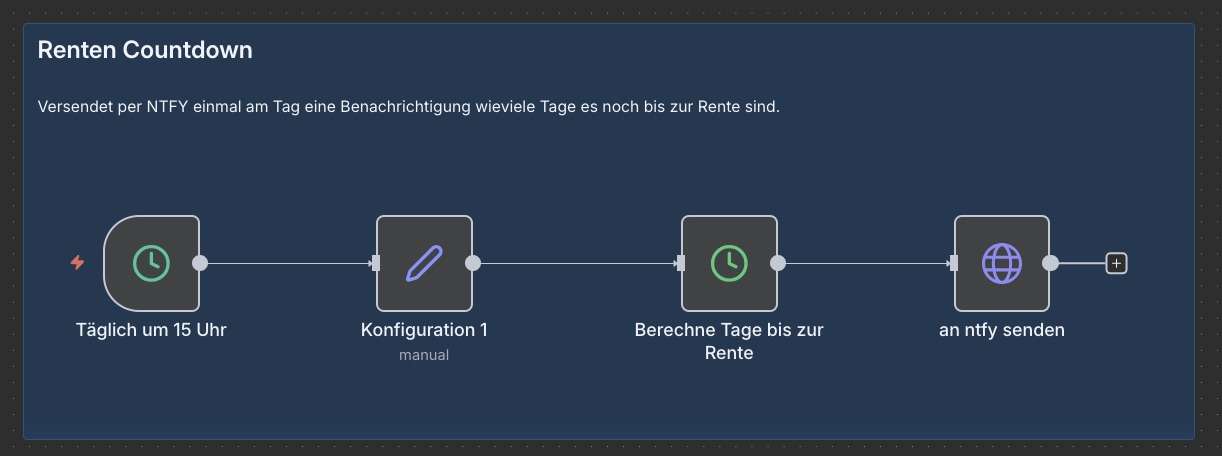 Dieser Workflow sendet täglich eine Benachrichtigung auf das Handy mit der Anzahl der verbleibenden Tage bis zur Rente. Die vier Kernkomponenten arbeiten zusammen, um einen automatisierten Countdown zu realisieren, der lokal auf dem Raspberry Pi Docker-Container läuft und unabhängig von externen Diensten funktioniert.