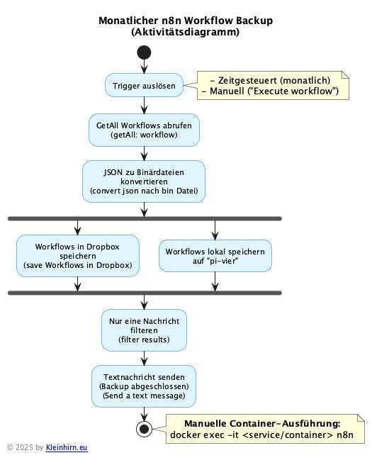 Zusammengefasst automatisiert dieser n8n-Workflow die monatliche Sicherung der Workflows sowohl in der Cloud (Dropbox) als auch lokal auf einem Raspberry Pi („pi-vier“) und informiert per Nachricht über den Abschluss der Sicherung.
