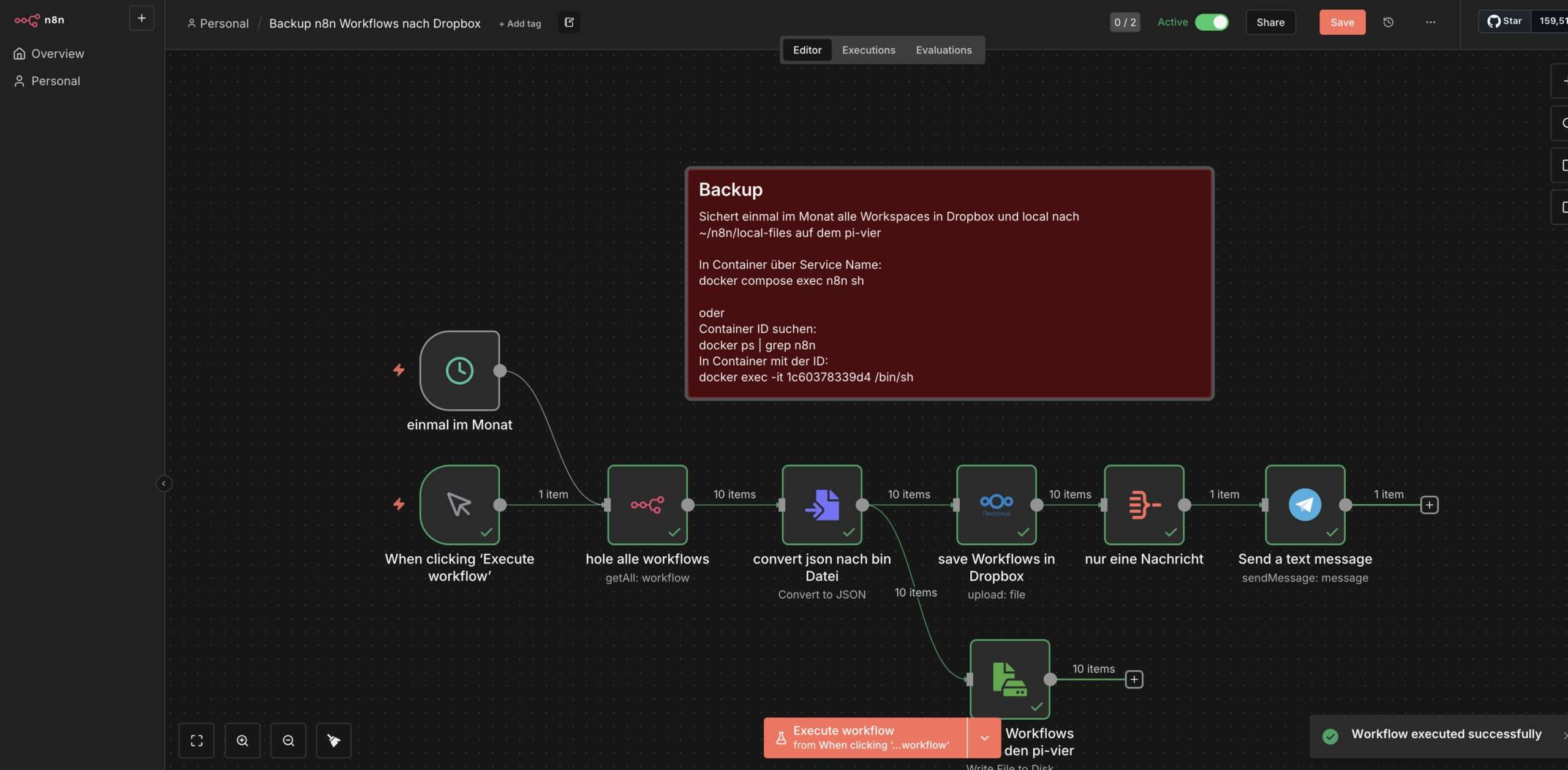 Der n8n-Workflow sichert einmal im Monat alle Workspaces in Dropbox und lokal auf dem Gerät „pi-vier“.