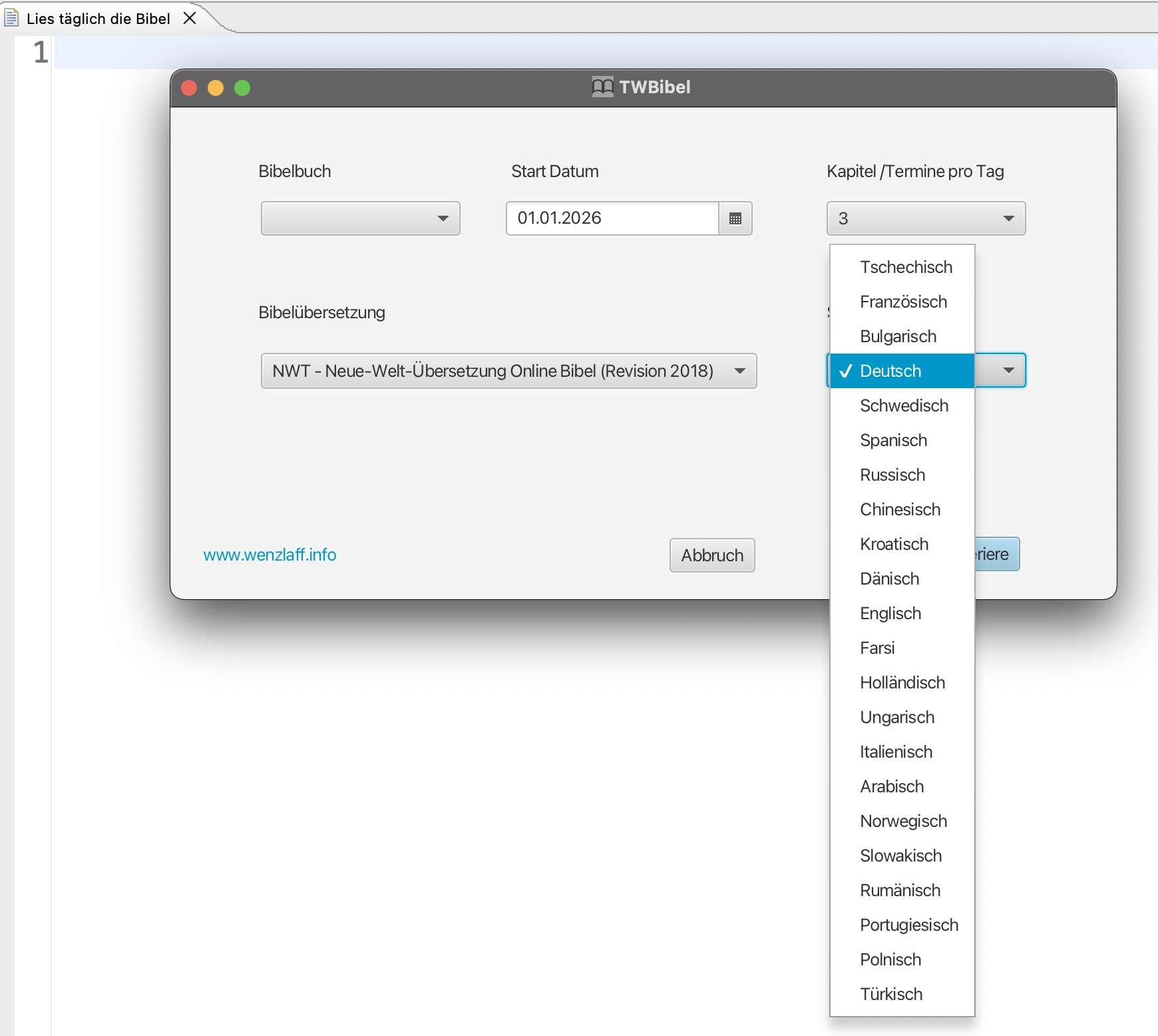 Wer die Pläne in anderen Sprachen oder andere Bibelübersetzungen haben will, kann das mit dem Java-Programm TWBibel selbst generieren.